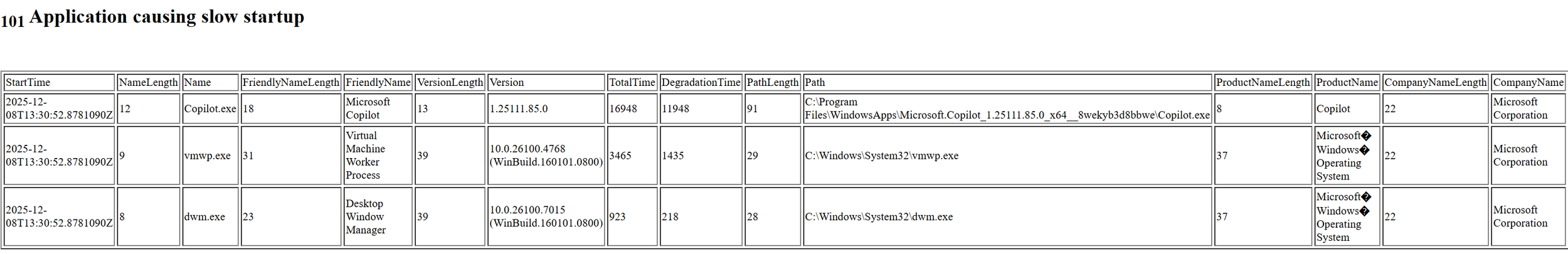 Example of application name and time they have taken in milisecons, e.g. 11948 is 11.948 seconds for Copilot.exe to launch as part of startup.
